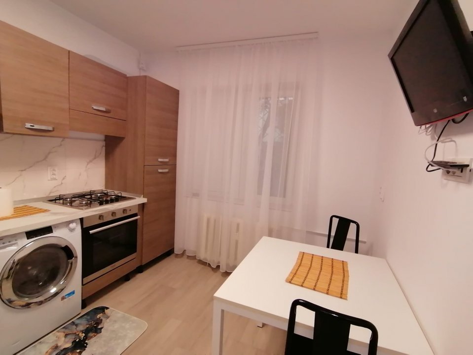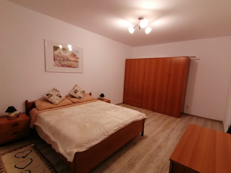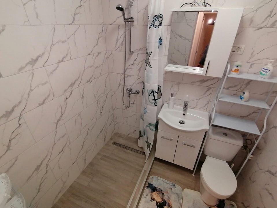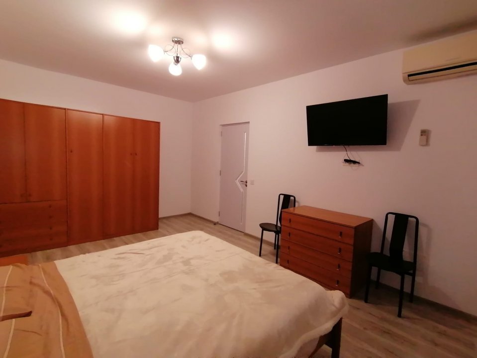 Camera este dotata cu pat matrimonial, dressing cu multiple spatii de depozitare, comoda TV, 2 noptiere, aer conditionat Mitsubishi de 12.000 BTU si televizor. Bucataria este dotata cu mobila moderna si echipata cu plita marca Bosh, cuptor electric Hotpoint, frigider Samsung, masina de spalat Candy cu uscator, hota, masa de 2 persoane. Baia este si ea complet renovata avand toate obiectele sanitare noi si cabina de dus cu scurgere in pardoseala.