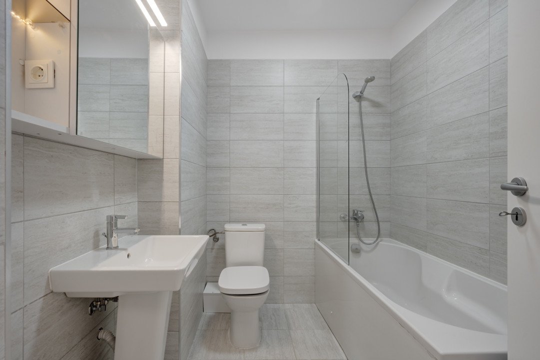 Bucataria este complet mobilata si utilata cu toate electricasnicele necesare: plita, cuptor, hota, masina de spalat vase, frigider, cuptor cu microunde. Baia este complet echipata cu obiecte sanitare, dotata cu cada si masina de spalat rufe.