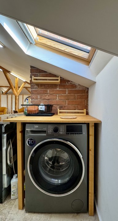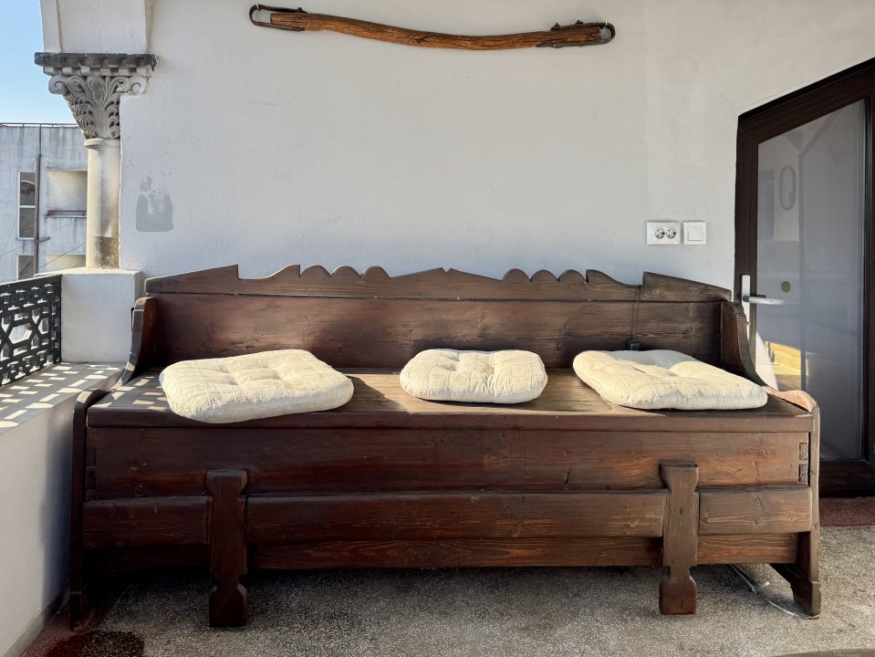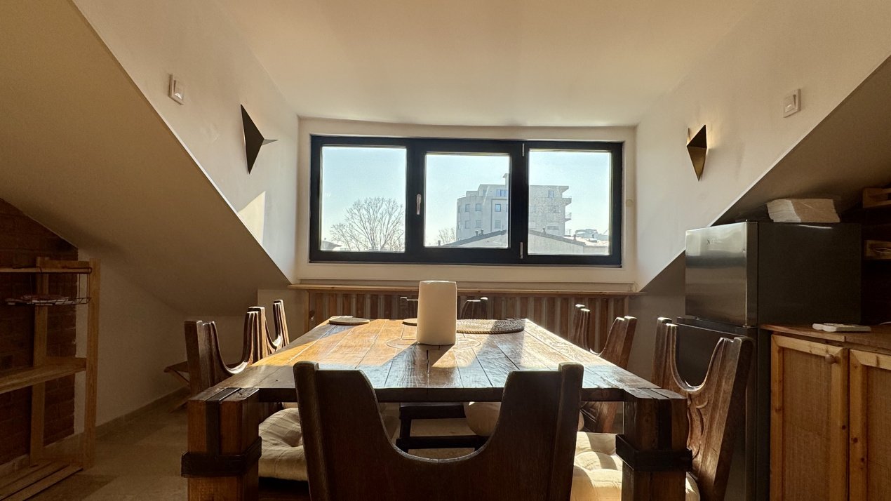 Locuința este dotată cu centrală termică proprie, două aparate de aer condiționat, bucătărie complet mobilată și utilată, iar baia beneficiază de fereastră pentru ventilație naturală. Mobilarea este realizată predominant din lemn, cu grinzi aparente și accente de cărămidă, oferind un aer cald și primitor, cu o atmosferă de loft cu influențe montane.