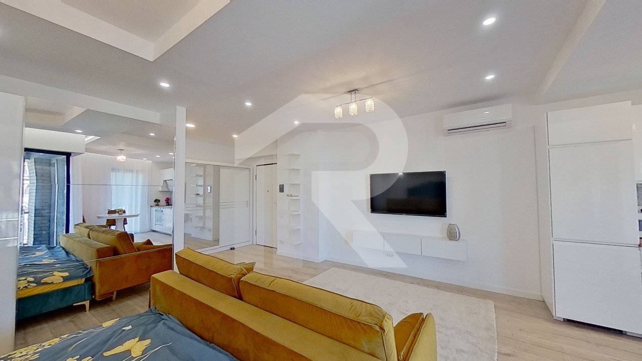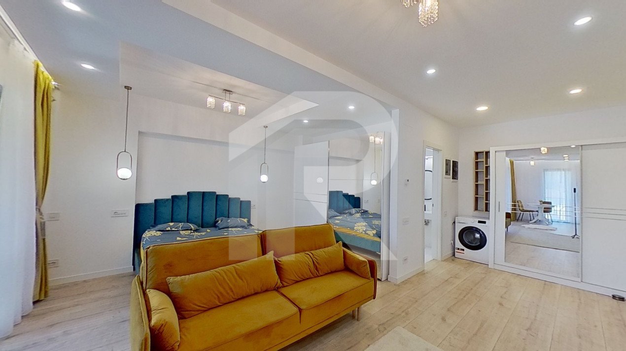 Mobilier Select: Design interior atent selectat pentru a combina estetica cu funcționalitatea, inclusiv o canapea extensibilă foarte confortabilă.