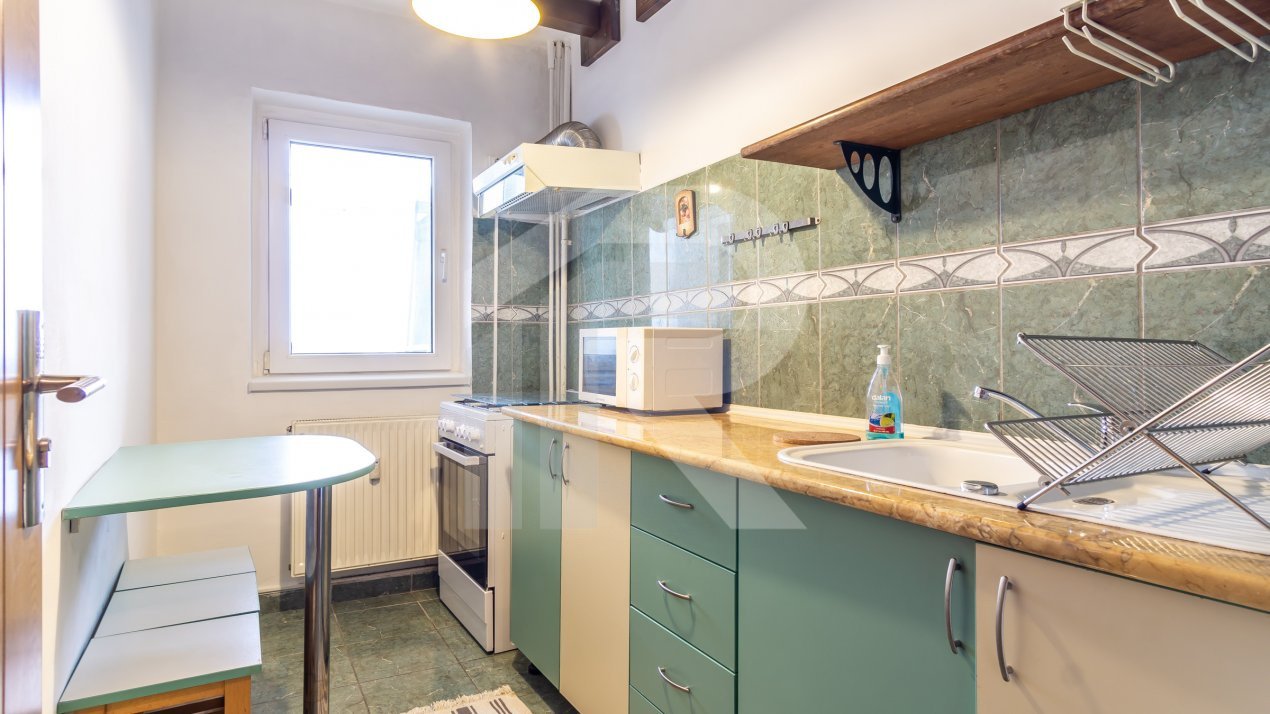 Baia are geam pentru ventilatie naturala, balcon inchis si bucataria este mobilata si complet utilata: aragaz cu rotisor (nou), hota cu aerisire, frigider, cuptor cu microunde, aer conditionat, masina de spalat rufe, TV LCD. Garsoniera este complet contorizata cu apometre si repartitoare, ambele cu citire radio. In camera avem o canapea extensibila mare (1,4m * 2m).