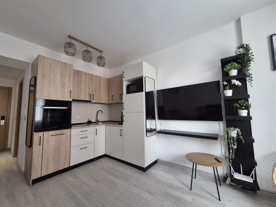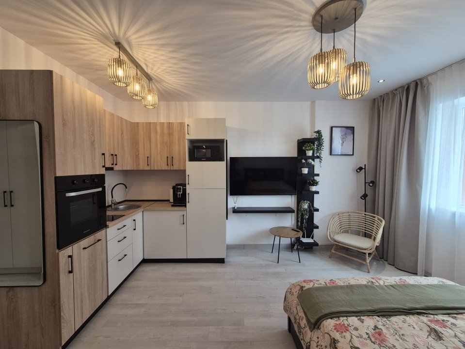 Imaginează-ți diminețile cu multă lumină naturală, într-un spațiu gândit pentru liniște și bună dispoziție. Această garsonieră primitoare, situată la etajul 5 al complexului Rin Grand Hotel, îmbină stilul scandinav cu funcționalitatea modernă, oferindu-ți tot ce ai nevoie pentru a te muta imediat.