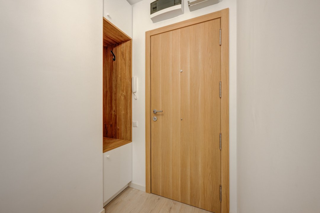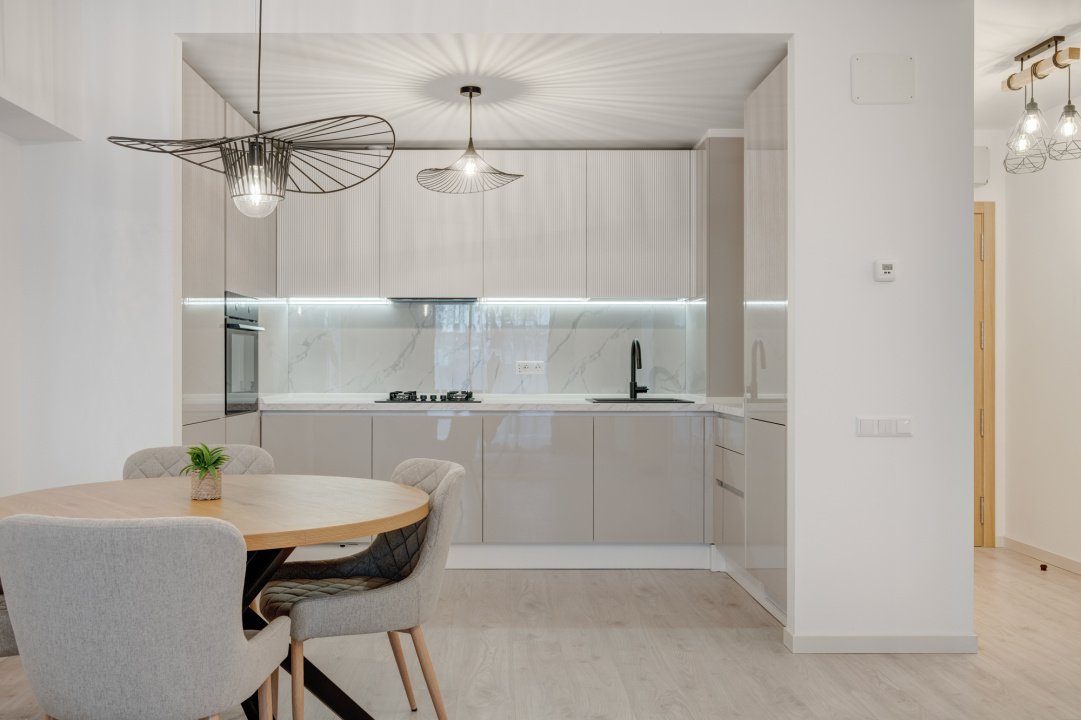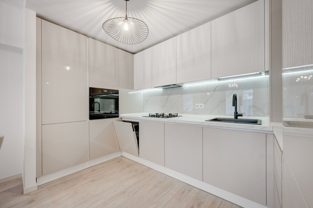 Bucataria este mobilata si utilata cu toate electrocasnicele necesare: masina de spalat vase, plita, cuptor, hota, frigider, toate incorporate in mobilier, noi si in garantie( marca Electrolux). Mobilierul de bucatarie oferta foarte multe spatii pentru depozitare.