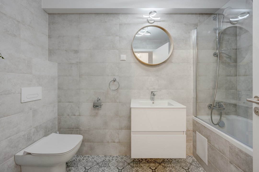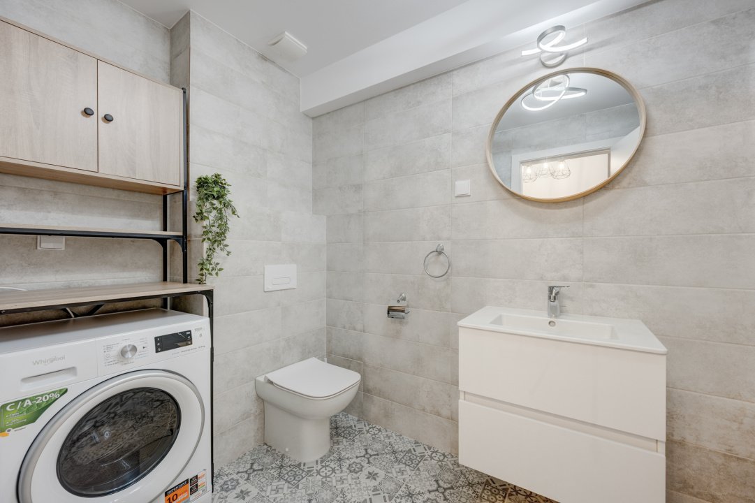 Baia este si ea full echipata cu obiecte sanitare noi, spatii de depozitare si masina de spalat rufe.