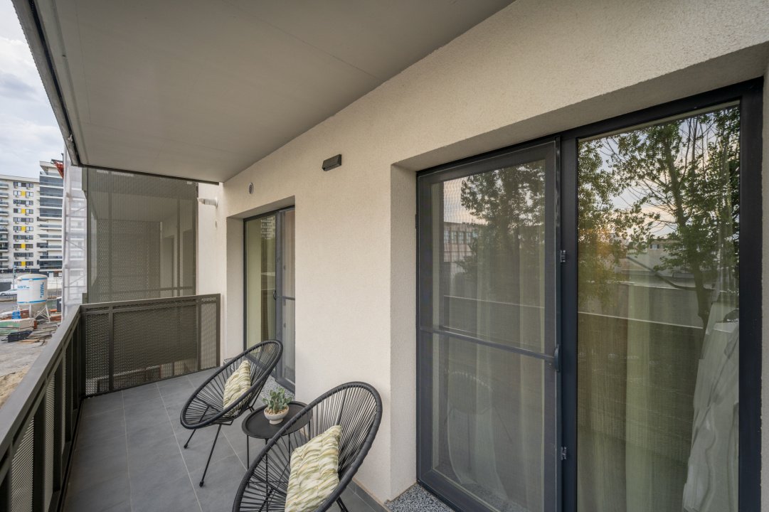 Terasa are acces atat din living cat si din dormitor si este amenajata cu 2 fotolii de exterior si o masuta de cafea.