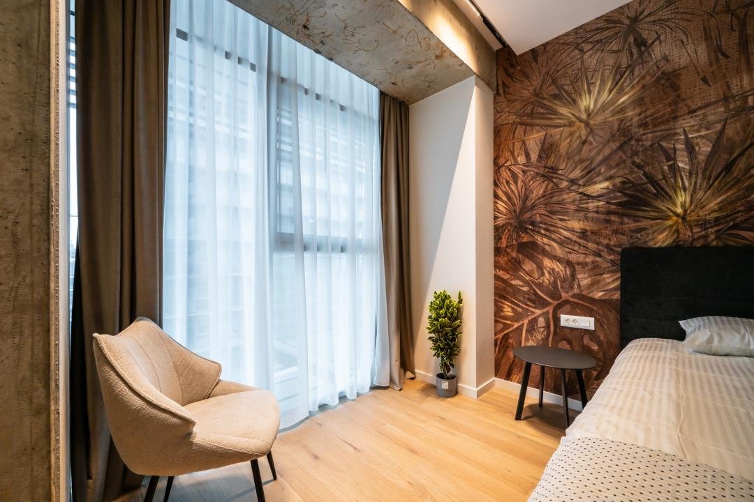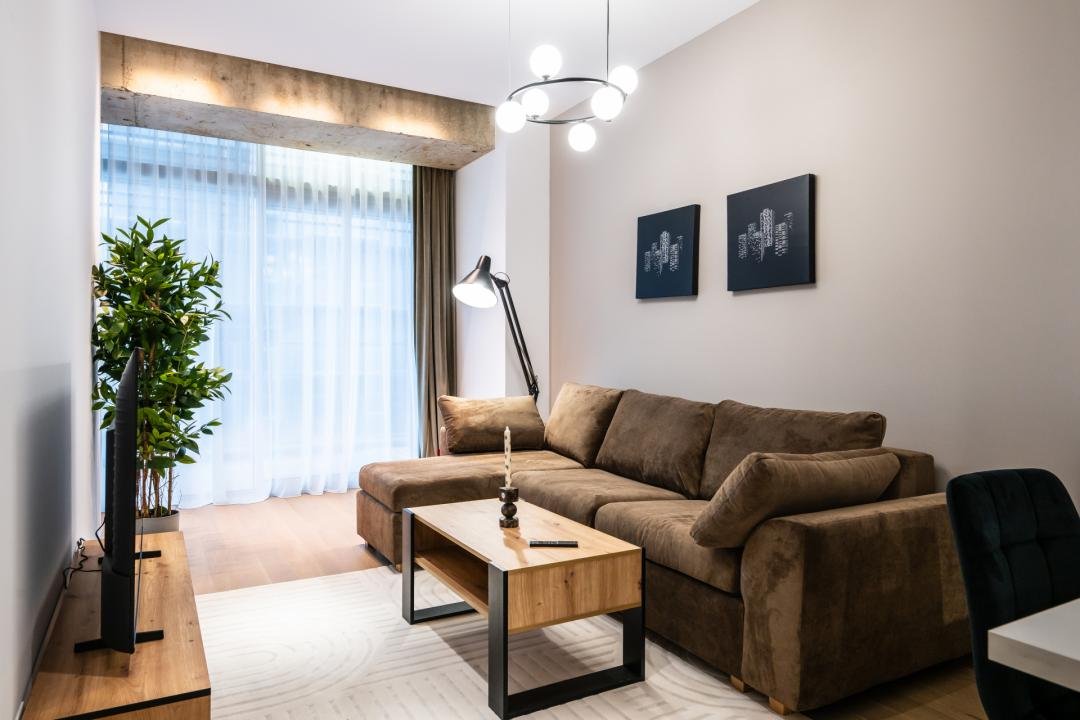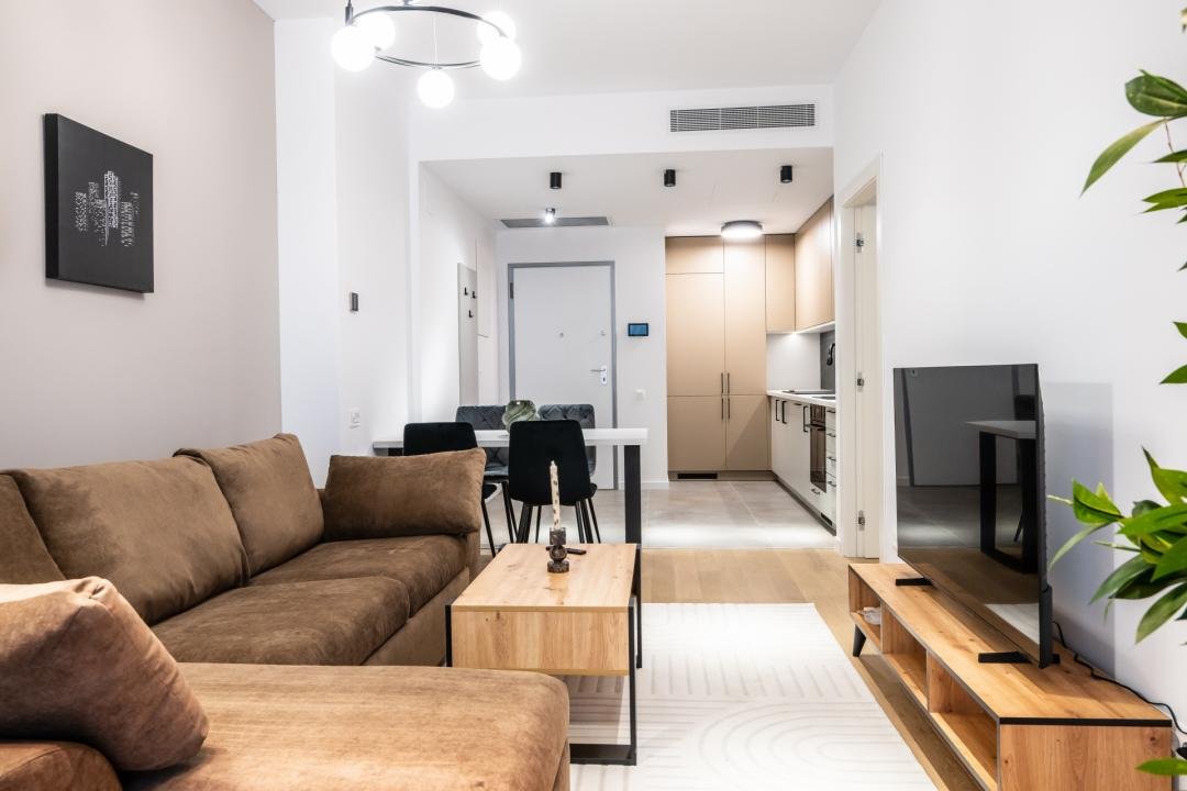 Compartimentarea cu 2 camere oferă o separare clară între zona de zi și zona de noapte. Livingul este generos, complet mobilat cu piese de mobilier contemporan, zonă de dining dedicată și spații vitrate ample. Bucătăria este integral echipată, cu electrocasnice încorporate și soluții eficiente de depozitare.