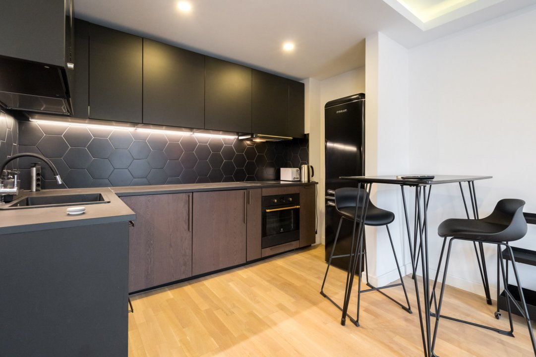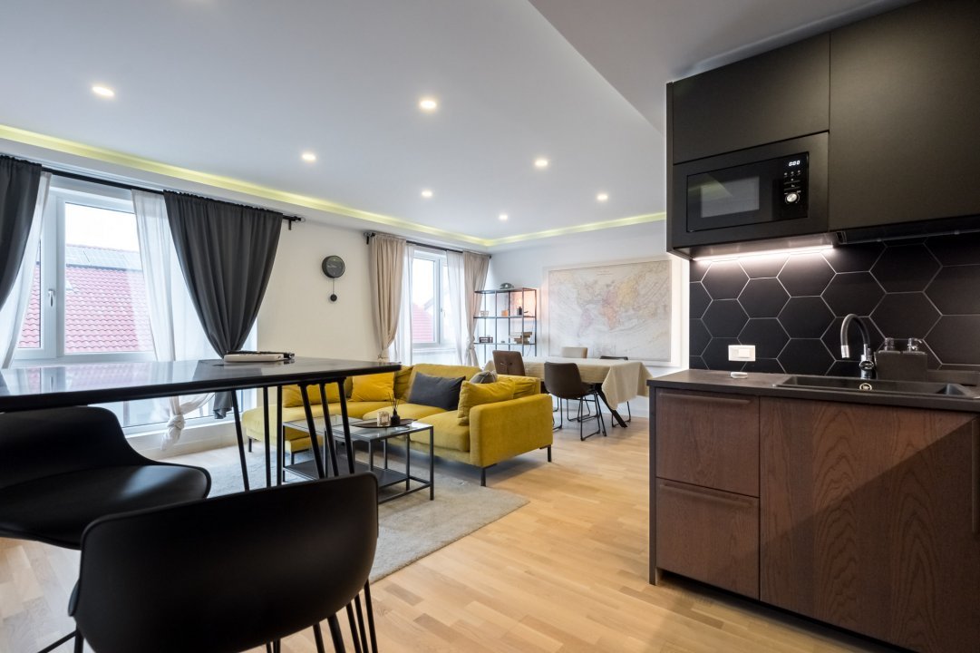 Bucătăria, integrată în living, este dotată cu electrocasnice moderne de înaltă calitate și mobilier funcțional, care optimizează fiecare centimetru de spațiu disponibil. Blatul mat conferă un aer luxos, iar plita și cuptorul electrice incorporate fac pregătirea meselor o experiență plăcută și eficientă. Un bar cu scaune înalte oferă un loc convenabil pentru micul dejun sau pentru servirea unor gustări rapide. Dotari apartament: cuptor cu microunde, masina de spalat, fierbator de apa, prajitor de paine, aer conditionat(cate unul in fiecare camera).
