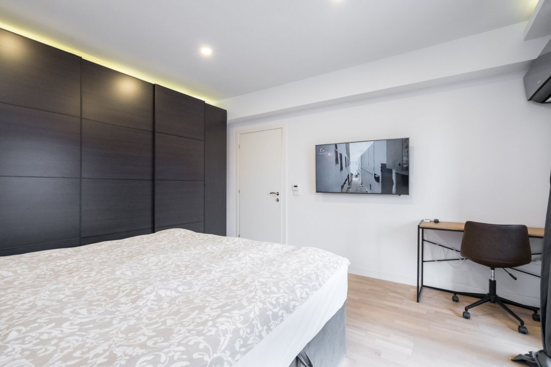 Dormitorul principal emană o atmosferă de relaxare și confort, fiind amenajat cu un pat matrimonial cu o saltea moale și lenjerii de calitate superioară. O noptieră elegantă alături de pat oferă spațiu pentru obiecte personale și lampă de citit, iar dulapul încorporat oferă un dressing generos pe tot peretele pentru haine și accesorii.