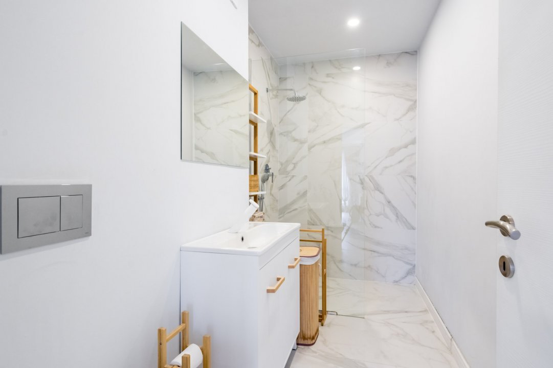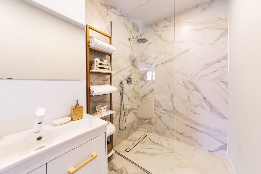 Baia este un sanctuar de rafinament, cu finisaje premium și accesorii moderne. Cabina de duș cu sticlă transparentă și lavoarul elegant adaugă un aer contemporan, iar oglinda iluminată și rafturile pentru depozitare completează funcționalitatea spațiului.