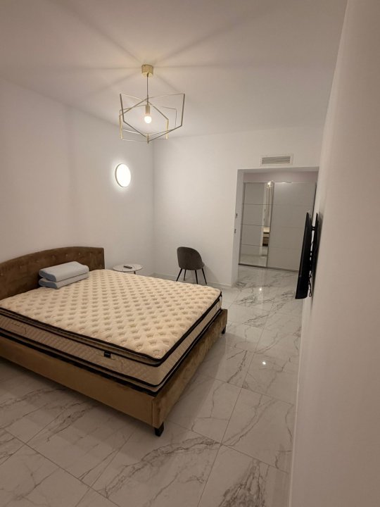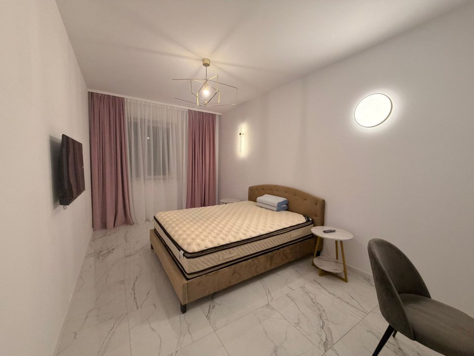 Apartamentul se inchiriaza complet mobilat și utilat, cu electrocasnice și piese de mobilier de calitate superioară, fiind gata pentru mutare imediată. Compartimentarea este bine gândită: hol generos dotat cu dressing, baie modernă cu cadă, mașină de spălat cu uscător și uscător de păr, dormitor matrimonial confortabil, prevăzut cu pat, saltea premium, perdele și draperii noi, plus un Smart TV de 140 cm cu Netflix. Bucătăria open space este complet echipată și se îmbină armonios cu livingul, creând un spațiu primitor ideal pentru relaxare.