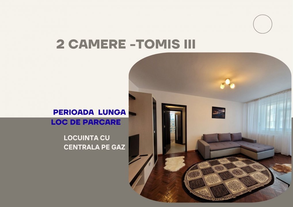 Va ofer spre inchiriere un apartament cu 2 camere confort 1 cu 2 balcoane, la etajul 4, intr-un bloc cu lift, situat in zona TOMIS III - aproape de CITY. Apartamentul este mobilat si utilat, incalzirea se realizeaza cu ajutorul centralei proprii pe gaz, iar racirea cu ajutorul unui aparatat de aer conditionat.