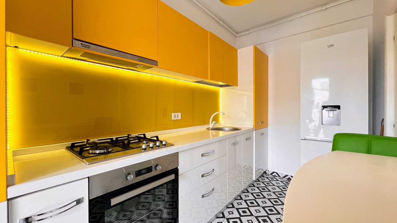 Bucătăria este închisă și complet echipată (aragaz/plită, cuptor, hotă, frigider, mașină de spălat etc.). Incalzirea se face prin pardoseala.