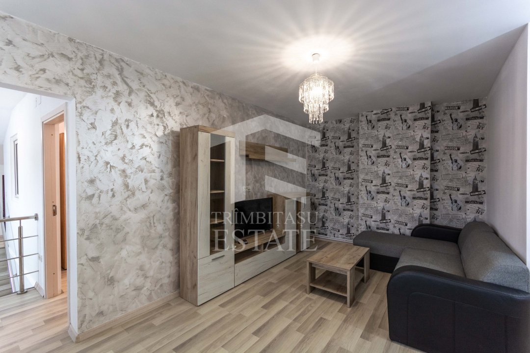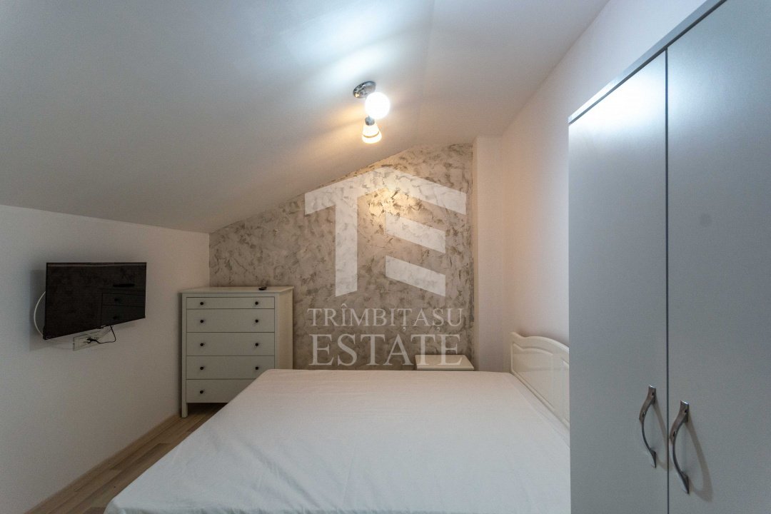 Apartamentul se afla la mansarda unei vile(singur pe etaj), constructie 2007, in suprafata totala de aproximativ 130 mp, foarte bine impartit intr-o zona de relaxare si doua zone de dormit, ce dispune de toate amenajarile de care ar avea nevoie un potential chirias (maina de spalat rufe, uscator rufe, frigider, aragaz, aparat aer conditionat, incalzire centrala termica, 2 TV).