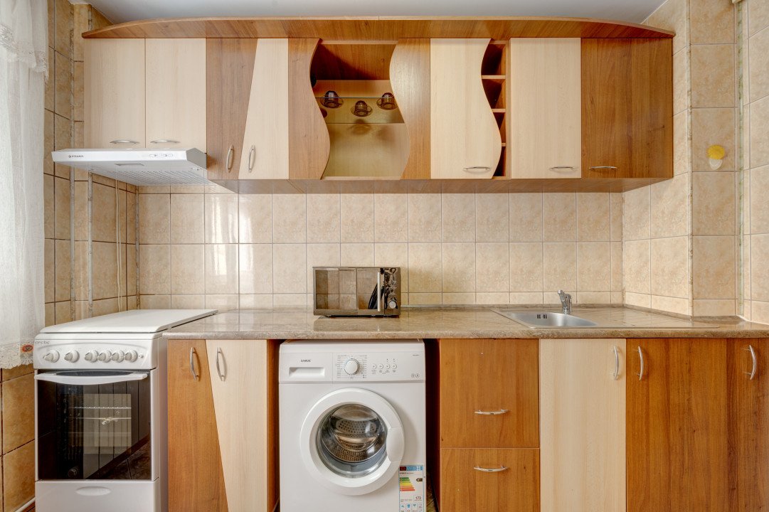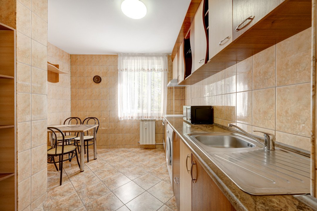 Bucataria este mobilata si dotata cu aragaz, hota, frigider, masina de spalat rufe si cuptor cu microunde. Tot in bucatarie este si locul de luat masa pentru 4 persoane. Bucataria este extrem de spatioasa.