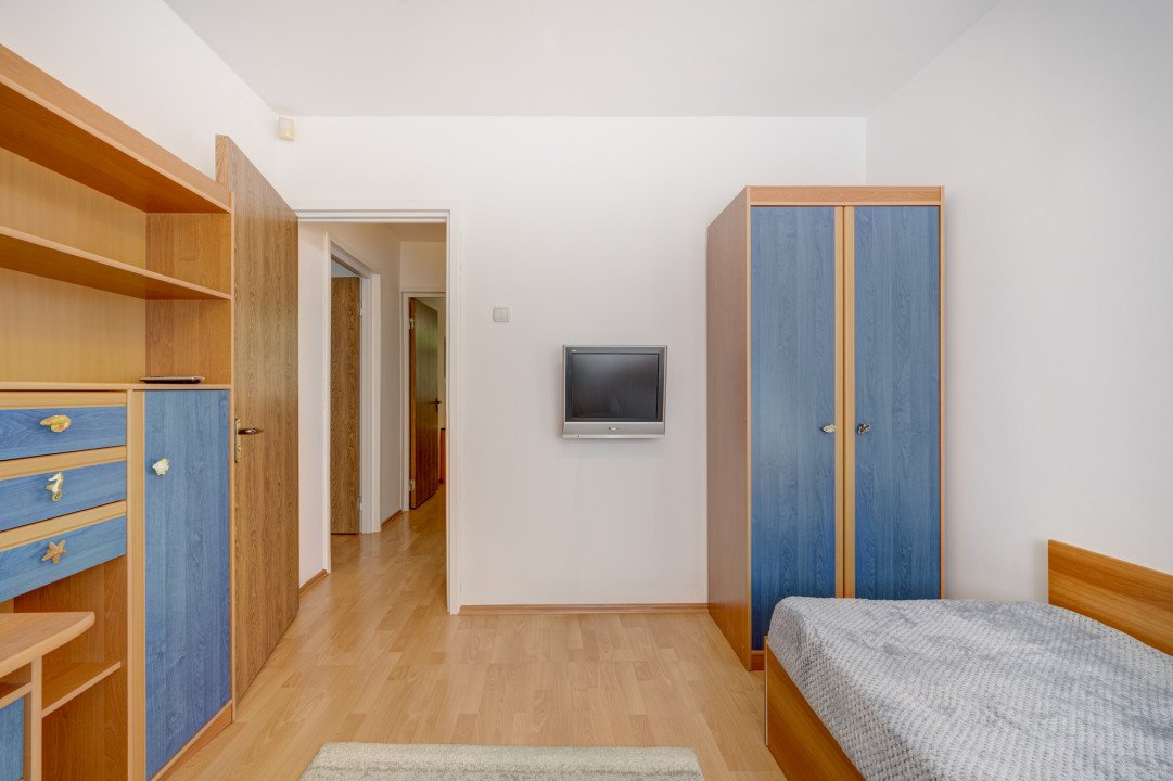 Al doilea dormitor este amenajat pentru un copil si are pat pentru o persoana, birou cu spatii pentru depozitare, dulap pentru haine, TV .