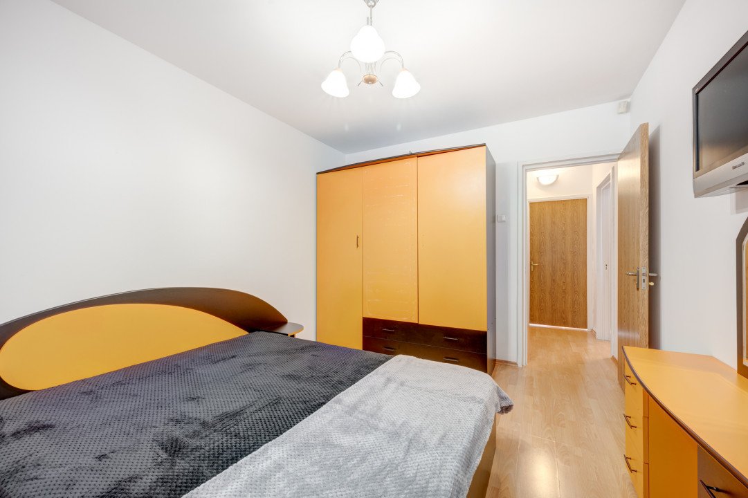 Dormitorul matrimonial are pat dublu cu saltea, dulap pentru haine, noptiere si comoda. Din dormitorul mare se face accesul catre balconul ( logie) inchis.
