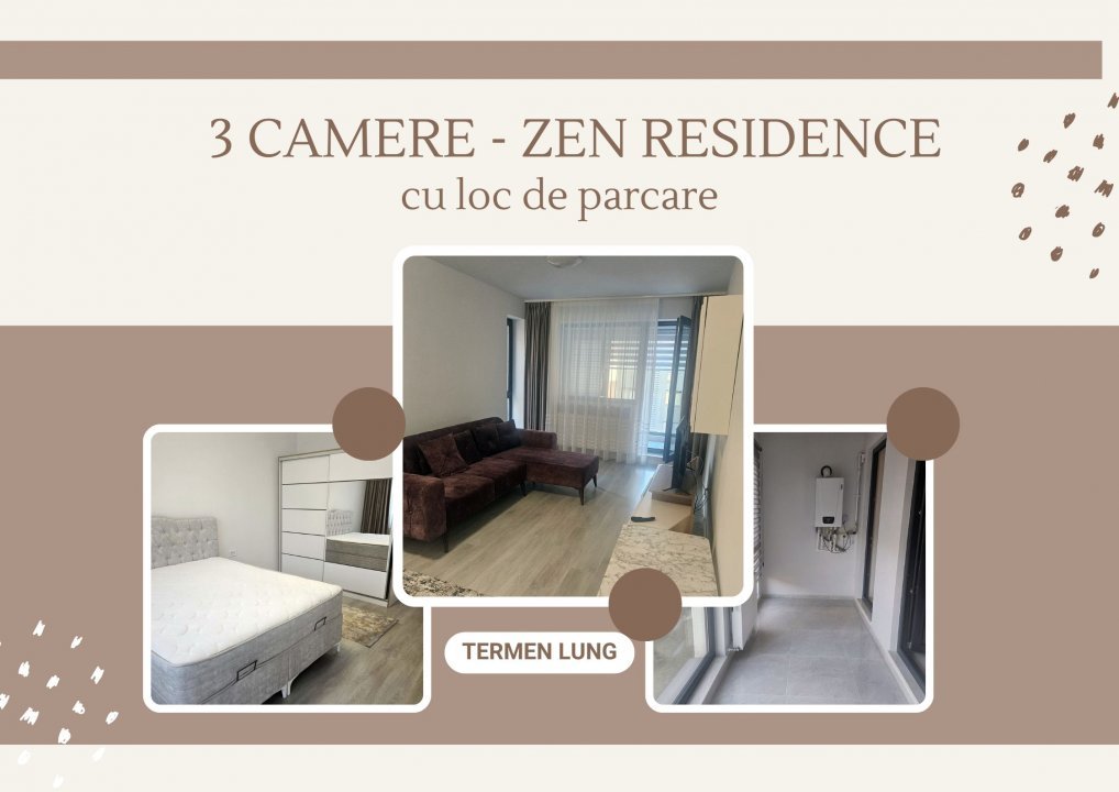 Va ofer spre inchiriere un apartament cu 3 camere decomandate situat in ZEN-rezidence. Apartament cu 2 dormitoare, living, 2 balcoane, 2 baie, bucatarie inchisa, este pozitionat la etajul 2 intr-un bloc cu lift. Locuinta este mobilata si utilata nou, beneficiază de încălzire cu centrala termica pe gaz și aer condiționat, asigurand confortul optim în orice sezon. Apartamentul detine loc parcare