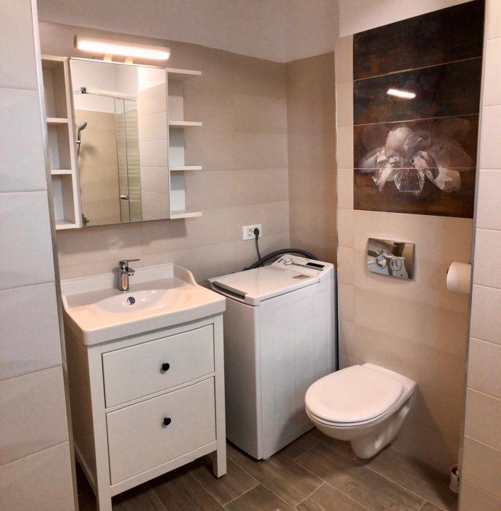 Bucătăria este complet utilată, cu mașină spălat vase, baie cu dus si masina de spalat rufe, iar balconul are 3mp.