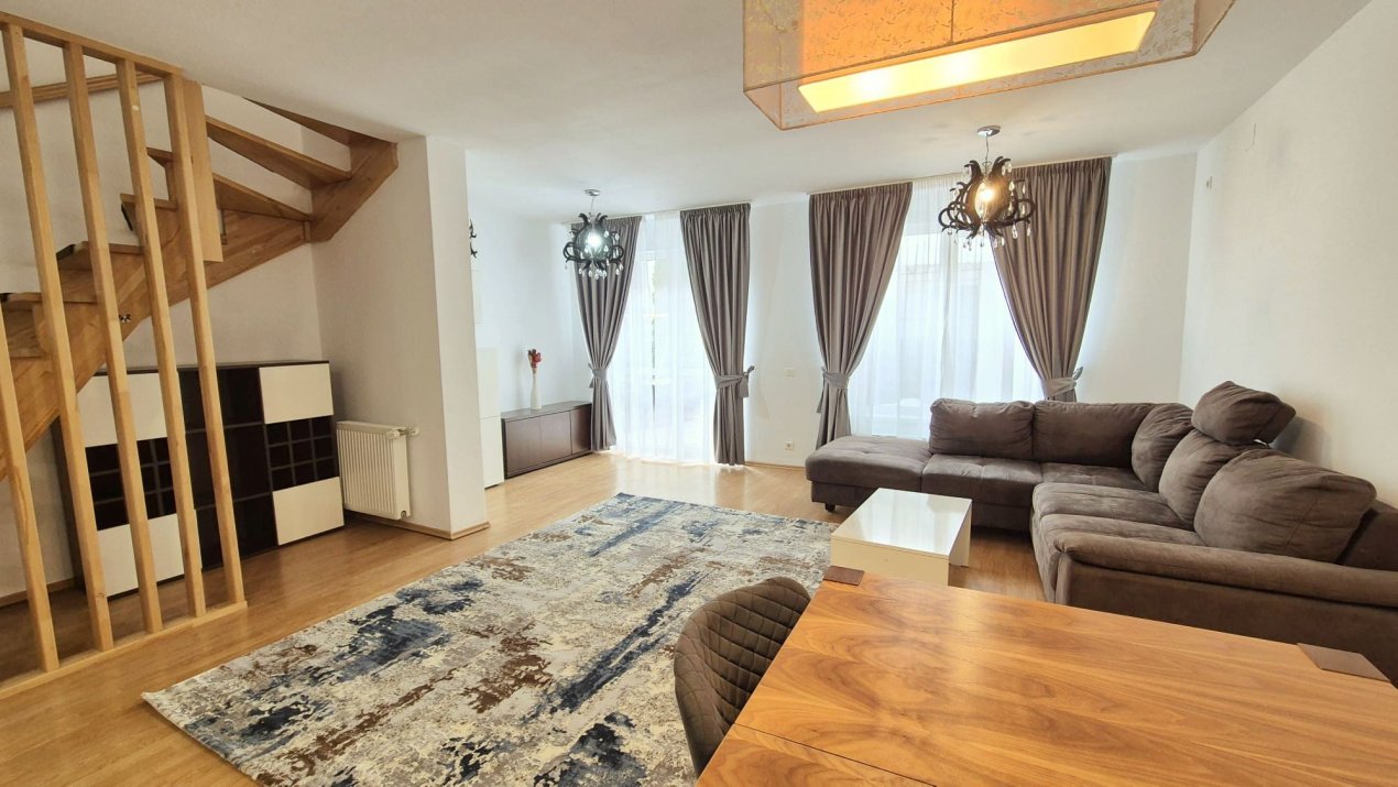 Kronhouse Real Estate va propune spre inchiriere un apartament 4 camere, la casa in Complexul Green Valley, in apropierea Lacului Noua si la cateva minute de gradina zoologica. Locuinta are o suprafata aproximativa de 135 mp, cu 3 bai si o gradina tip terasa de aproximativ 30 mp. Imobilul este structurat astfel :P+1+M: La parter avem: bucataria open-space cu livingul, wc de serviciu, debara si gradina tip terasa. La nivelul 1 avem: 2 dormitoare(unul mobilat si unul nemobilat), dressing si baie cu cada. La mansarda avem: dormitor, dressing si baie cu dus. Apartamentul este mobilat partial.. Nu se accepta cu animale de companie in locatie, fara studenti.
