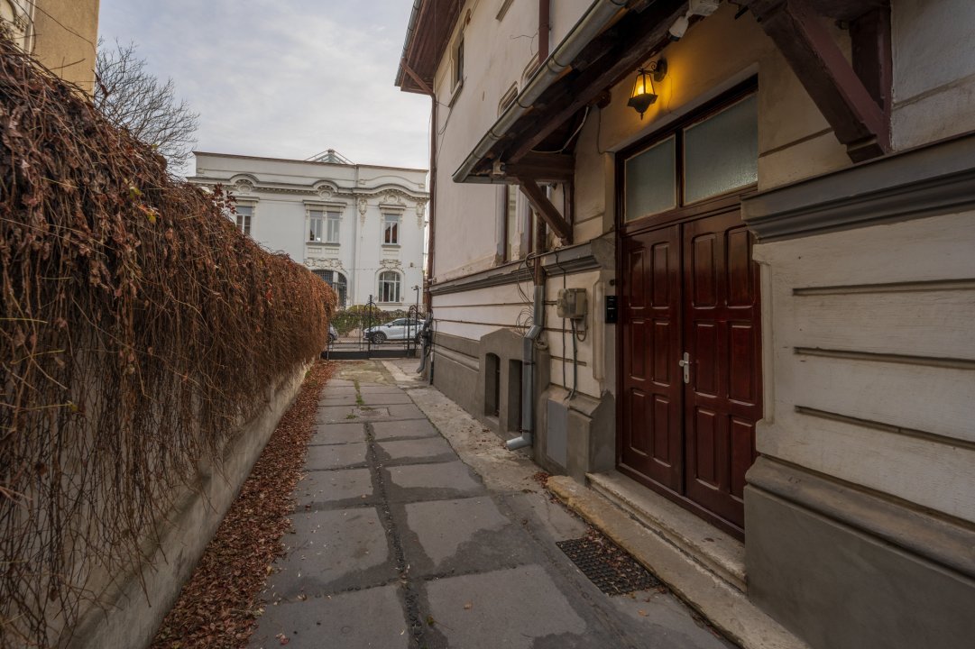 Accesul se face printr-o scară impunătoare din lemn masiv, care duce către apartamentul cu cele 4 camere spațioase, ideale pentru birouri sau săli de ședință. Tavanele înalte și detaliile arhitecturale clasice contribuie la o atmosferă elegantă și funcțională.