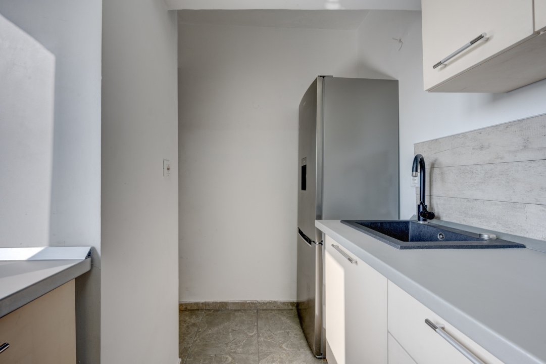 Bucataria este mobilata si utilata cu plita, cuptor, frigider, masina de spalat rufe si uscator de rufe. Baia este amenajata cu cabina de dus si obiecte sanitare noi. Camera este mobilata cu pat matrimonial, dulapuri pentru haine si o zona de luat masa si TV. Pardoselile sunt placate cu parchet laminat in camera si gresie in hol, baie si bucatarie.