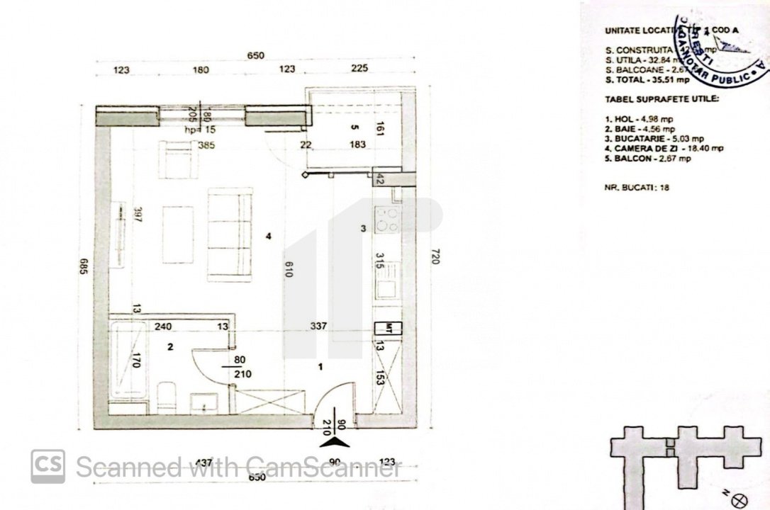 Studioul are o suprafata utila totala de 35.5mp dintre care 2.8mp de balcon. Orientarea este catre N-E, iar vederea este libera, catre lac.