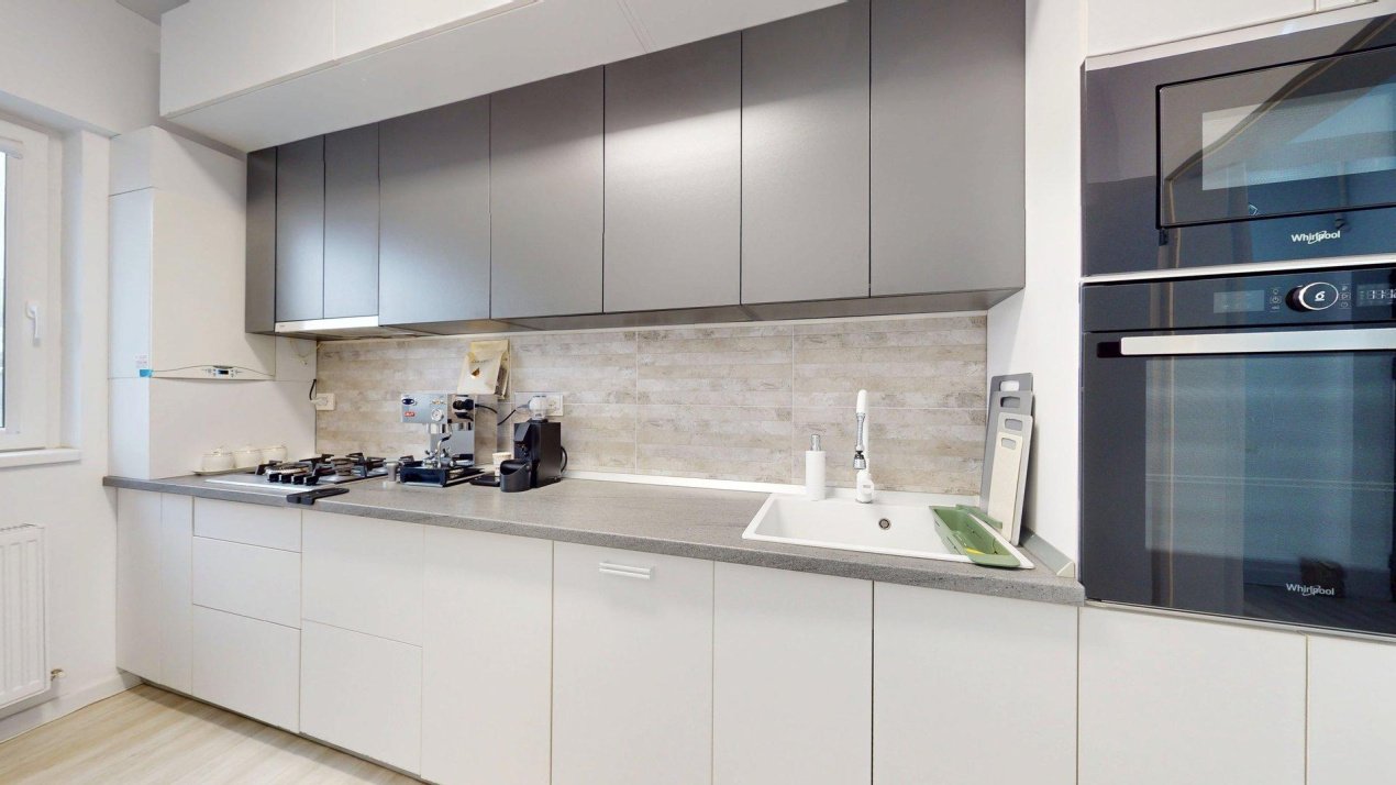 Bucătărie Gourmet: Mobilier realizat pe comandă, echipat cu cuptor și cuptor cu microunde încastrate Whirlpool, plită pe gaz Beko și combină frigorifică de mare capacitate.