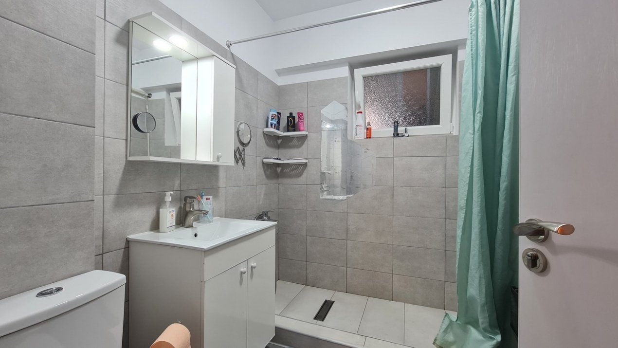 Baie moderna cu dus walk-in, sifon de pardoseala si geam. Holul dispune de dressing generos, ideal pentru depozitare.