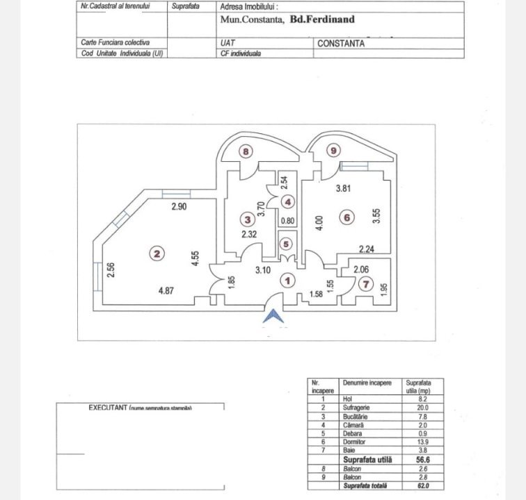 Suprafata utila este de 56,6 mp, plus doua balcoane de 2,6 mp si 2,8 mp.