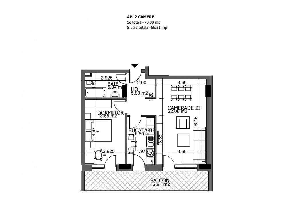 Detalii apartament: Apartament cu 2 camere, suprafata utila total de 66,31 mp din care 12,91 balconul.