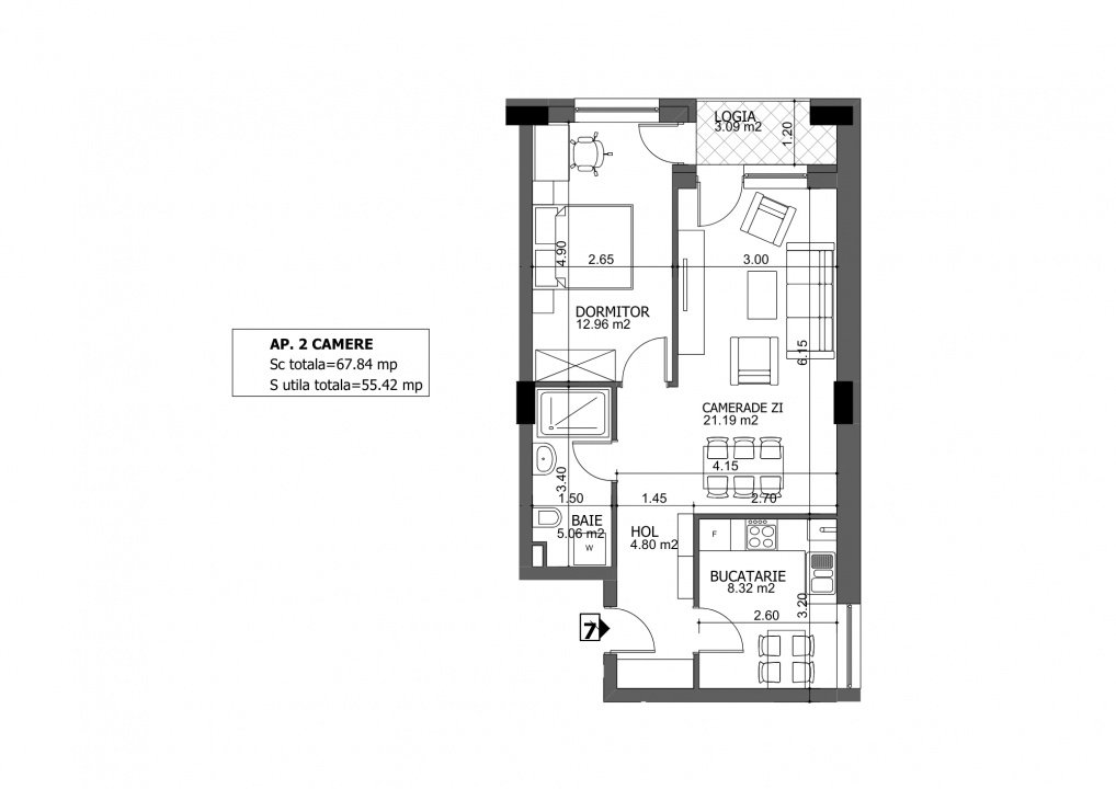 Detalii apartament: Apartament cu 2 camere, suprafata utila total de 55,42mp din care 3,09mp balconul.