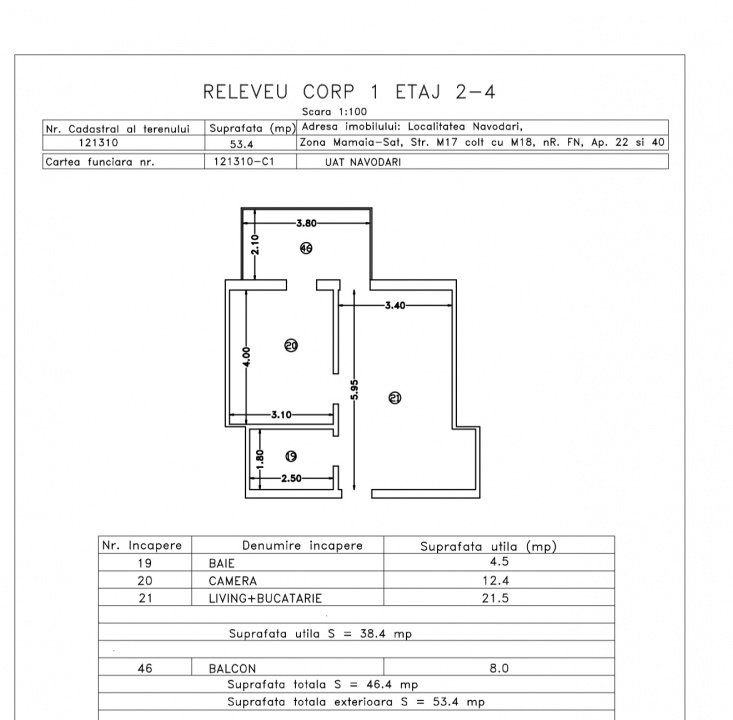 • Suprafață utilă (cu balcon): 46,4 mp