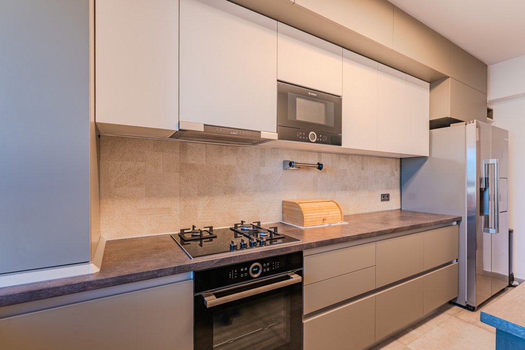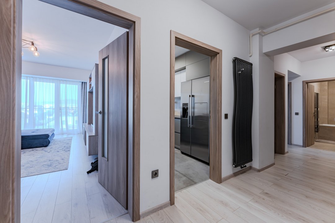 Astfel, bucataria este dotata cu: frigider side by side - cu dispenser de gheata si spatiu bauturi, cuptor cu microunde incorporat, aragaz, cuptor electric, masina de spalat vase, hota. In lfiecare camera se afla cate un smart TV, iar in living exista si un sistem audio performant.