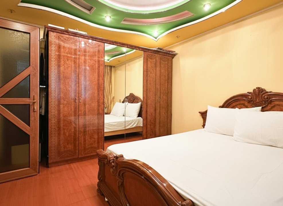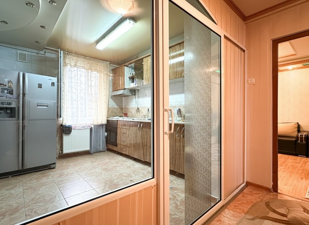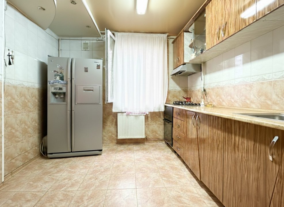 Apartamentul are 60 de metri pătrați utili, decomandat: două dormitoare suficient de generoase pentru paturi duble și dulapuri, un living în care încape masa de familie, o bucătărie spațioasă unde poți să gătești confortabil, nu să te învârți între frigider și aragaz. Spațiile sunt reale, nu optimizate la milimetru ca în blocurile noi unde doar pe hârtie încap lucrurile.