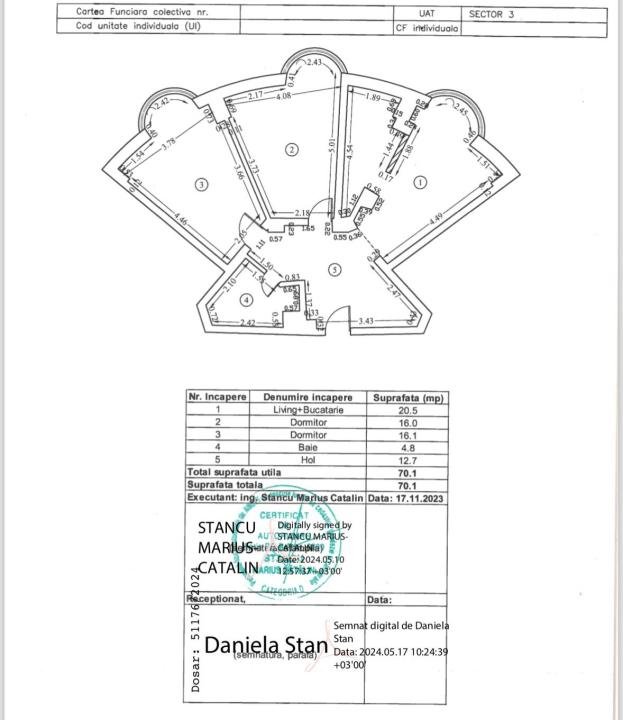 Apartamentul este amplasat la etajul 5 din 9, într-un bloc solid și bine întreținut, și are o suprafață utilă de 70 mp, cu compartimentare decomandată, ceea ce oferă intimitate, lumină naturală și un flux excelent al spațiilor.