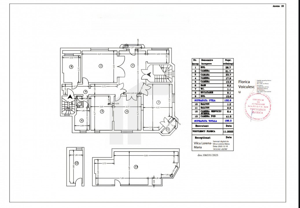 Apartamentul are o suprafata utila de 132,9 mpu, 2 balcoane 1, 2 si 2,3 mpu, la care se adauga, o boxa (camera de serviciu la subsol),  de 8,4 mp si o camera in pod, in suprafata de 41,5 mpu (suprafata totala 186.3 mpu) .
