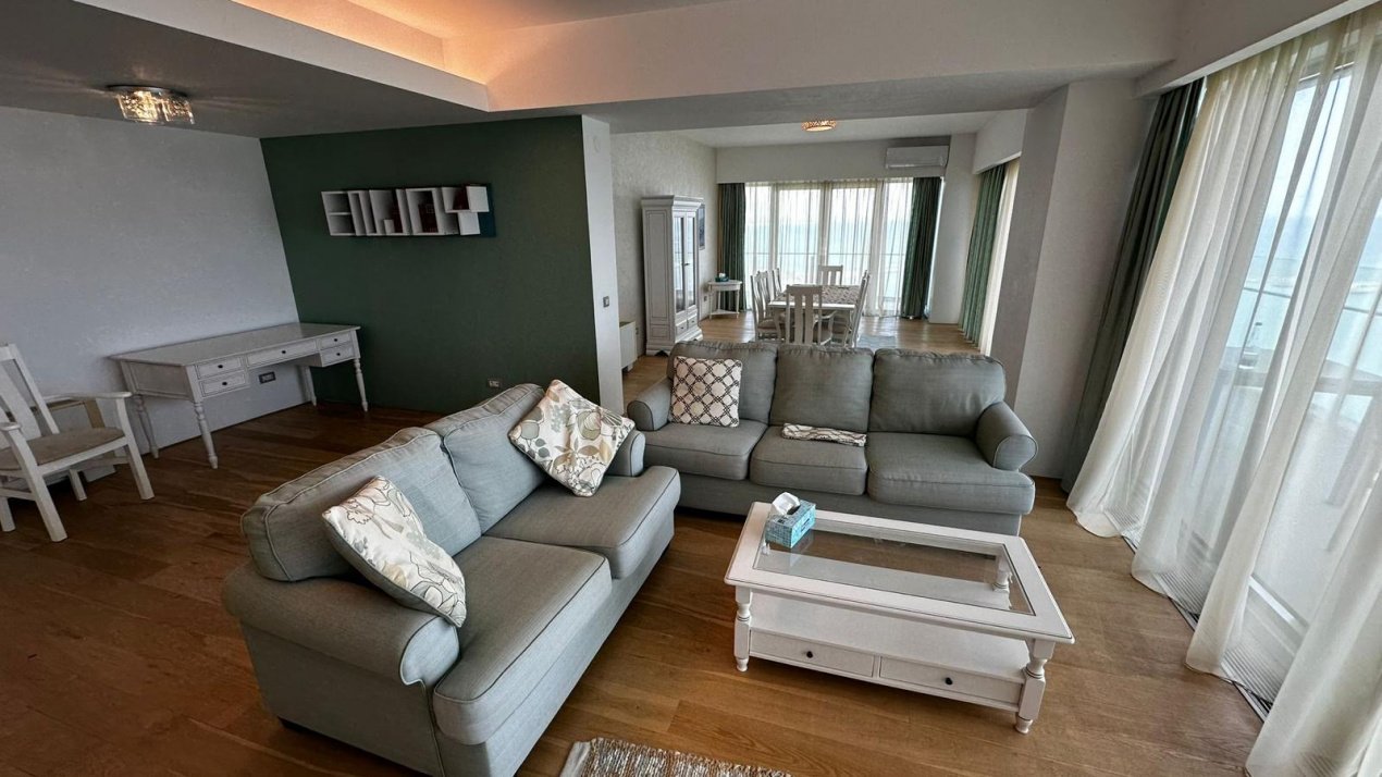Imaginați-vă diminețile începute pe terasă, cu sunetul valurilor și o panoramă neobstrucționată asupra mării, sau serile petrecute într-un living generos, scăldat în lumină naturală. Acest apartament tip duplex este gândit pentru un stil de viață premium, oferind spații ample și bine compartimentate: două living-uri elegante, ideale pentru relaxare sau socializare, trei dormitoare confortabile, un dressing spațios, bucătărie complet utilată și patru grupuri sanitare moderne.