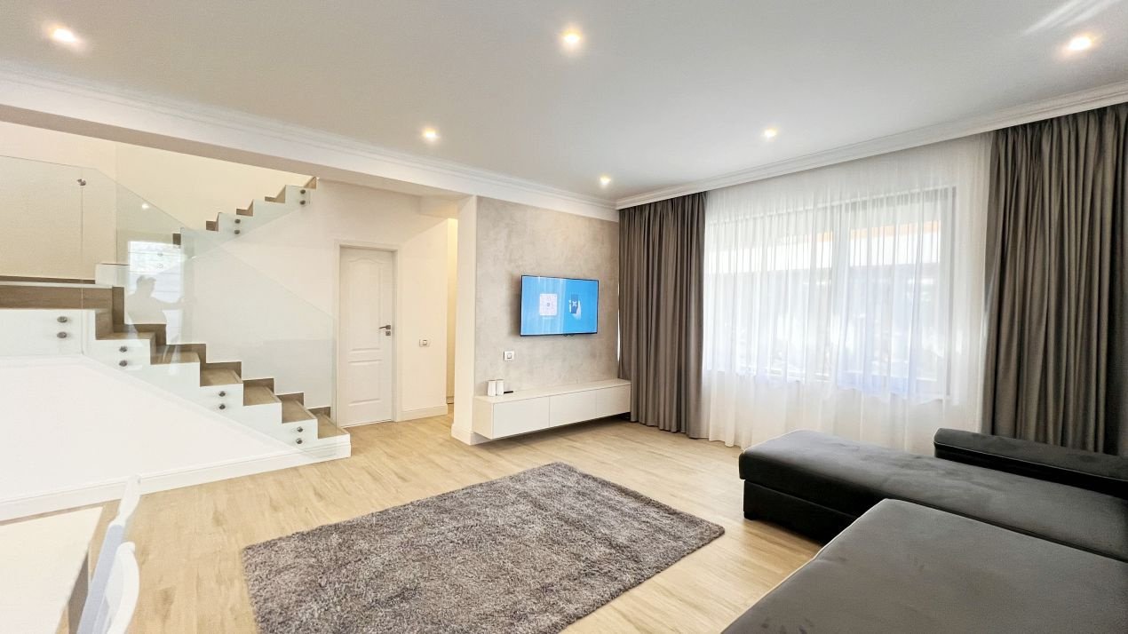 Vă propunem spre închiriere o vilă elegantă, situată într-un complex rezidențial exclusivist din Otopeni, pe strada Marin Preda. Proprietatea impresionează prin designul modern, finisajele de calitate și mobilierul nou, ales cu atenție pentru a crea un ambient rafinat și confortabil.
