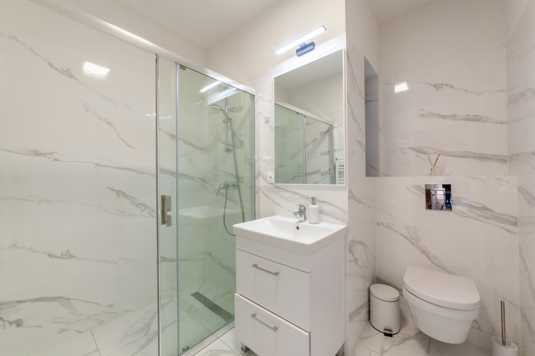 Etaj: 3 camere: doua dormitoare, dintre care unul matrimonial cu baie proprie, iar cea de-a treia camera poate fi amenajata in functie de necesitatile si preferintele chiriasului: dormitor suplimentar, dressing, birou sau sala de fitness. Exista o baie separata pentru celelalte camere.