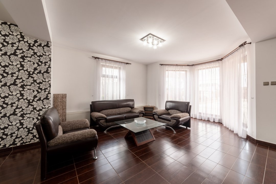 Parter: living mare, zona de dining sau birou, bucatarie inchisa cu camara, baie