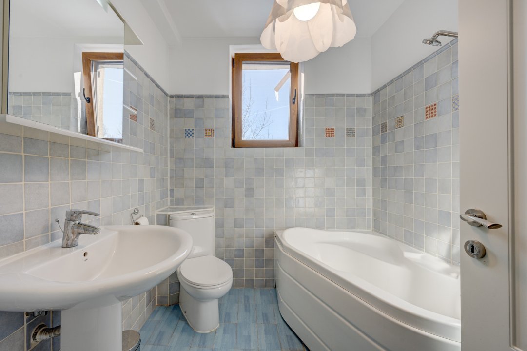 La subsol (19,7mp) este o camera tehnica pentru centrala si un spatiu pentru depozitare amenajat cu rafturi. Bucataria este inchisa, complet mobilata si utilata FRANKE cu toate electricasnicele necesare: plita, cuptor, hota, cuptor cu microunde, masina de spalat vase, frigider, toate incorporate. Tot mobilierul de bucatarie este din lemn masiv. Baia parterului este amenajata cu cabina de dus si beneficiaza de fereastra. Livingul este generos, cu o suprafata de 40 mp si este impartit in doua zone, o zona de dinning cu acces catre terasa exterioara si o zona de relaxare.