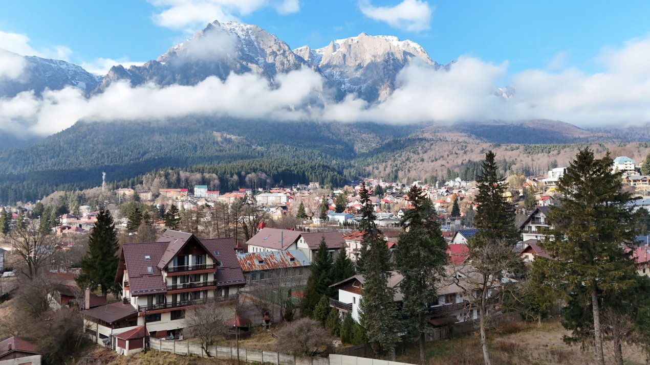 Proprietatea beneficiază de o priveliște spectaculoasă către Crucea Caraiman, unul dintre cele mai emblematice monumente ale Munților Bucegi. Acest avantaj unic constituie un argument major de marketing pentru atragerea turiștilor.