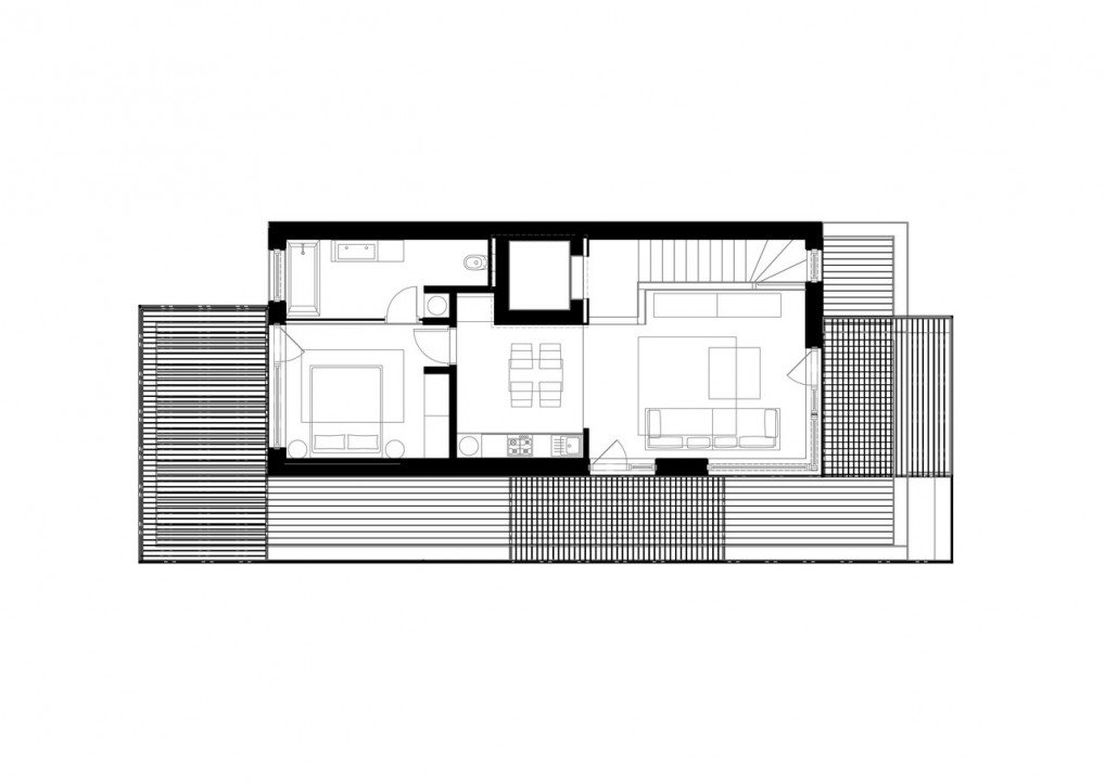Lemnul este folosit ca material „viu” cu sensibilitate deosebită, proprietăți tactile, capabil să „atrage” și să inducă o anumită stare. Locația sa este aleasă pentru a permite apropierea, atingerea directă. Prin urmare, fațada din zona teraselor are elemente verticale realizate integral din lemn tratat cu ulei. Contribuie la compoziția generală a casei, dar este accesibilă direct și de aproape. Plafoanele din lemn sunt foarte vizibile din stradă și foarte plăcute de pe terase, încadrate de margini din plăci de metal negre. . Plăcile din lemn și metal sunt montate cu atenție, cu caneluri pe pereți, tavane și punți, permițând ventilația și schimbările de dimensiune datorită variațiilor de umiditate și temperatură. "