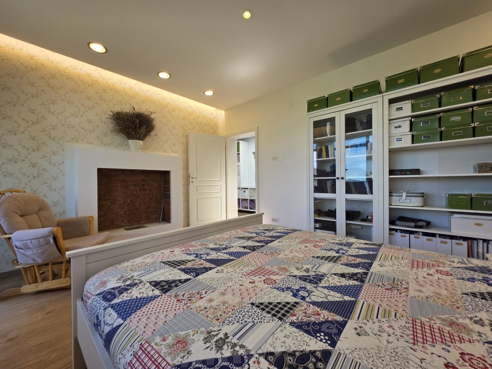 Etaj: două dormitoare generoase cu acces pe balcon, baie completă și zonă de birou/citit sub luminator