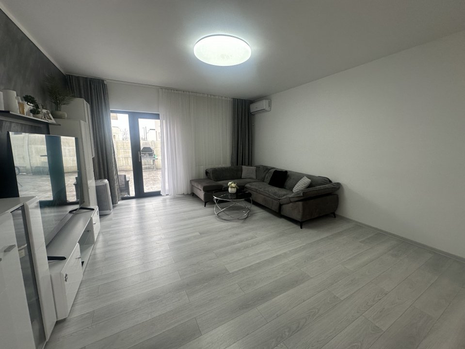 Compartimentare: Hol de acces cu spații eficiente pentru depozitare, dulap pentru haine și pantofar generos, Bucătărie mobilată și utilată, aragaz, frigider, mașină de spălat rufe, dotată cu centrală termică proprie, Living luminos, cu canapea colțar, comodă TV, televizor și aer condiționat, având acces direct către curtea din spate, Dormitorul mare complet mobilat, Al doilea dormitor, ideal pentru copil sau birou, Baie spațioasă, cu fereastră pentru aerisire naturală, cadă și cabină de duș.