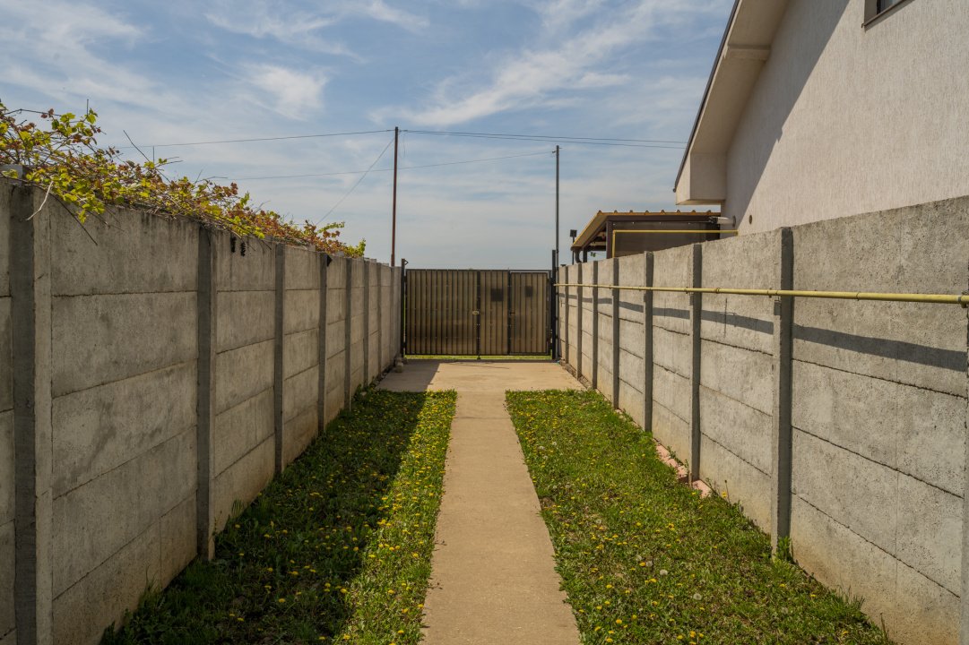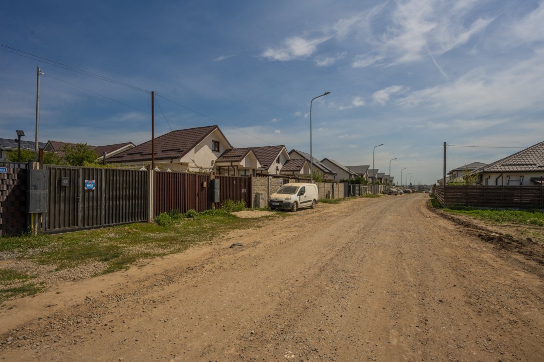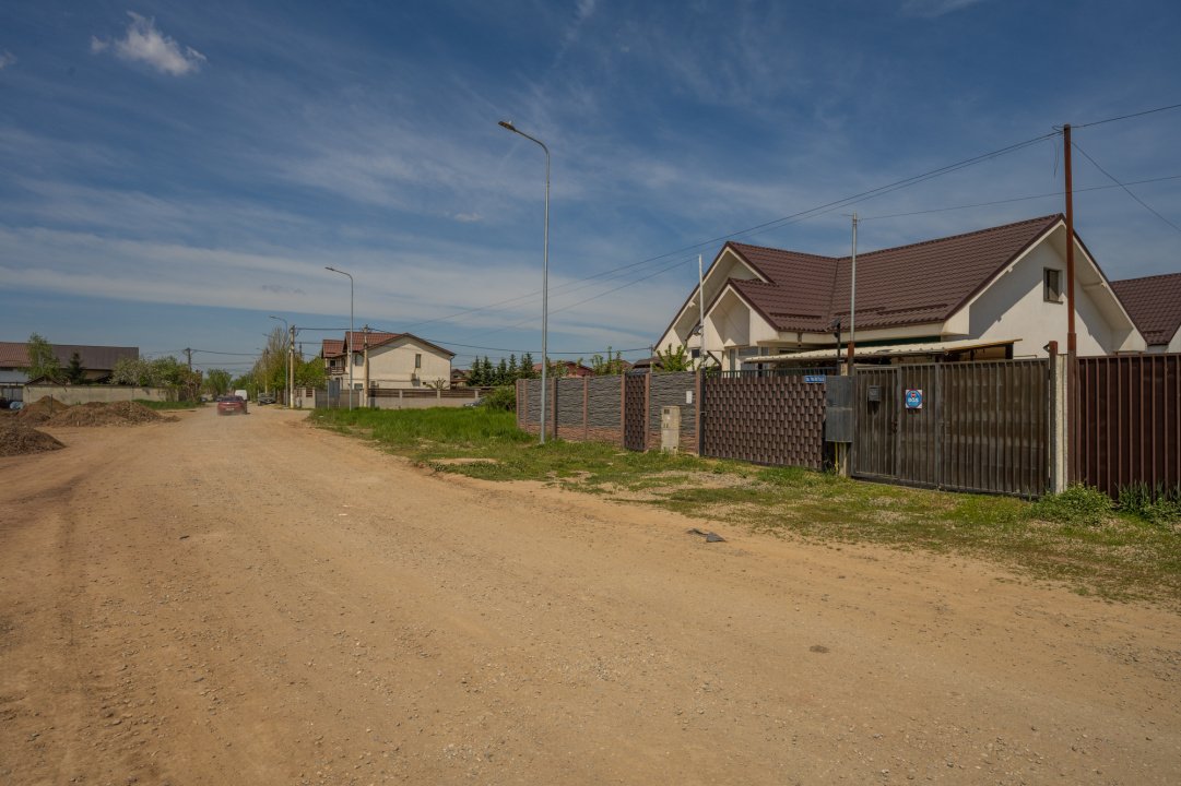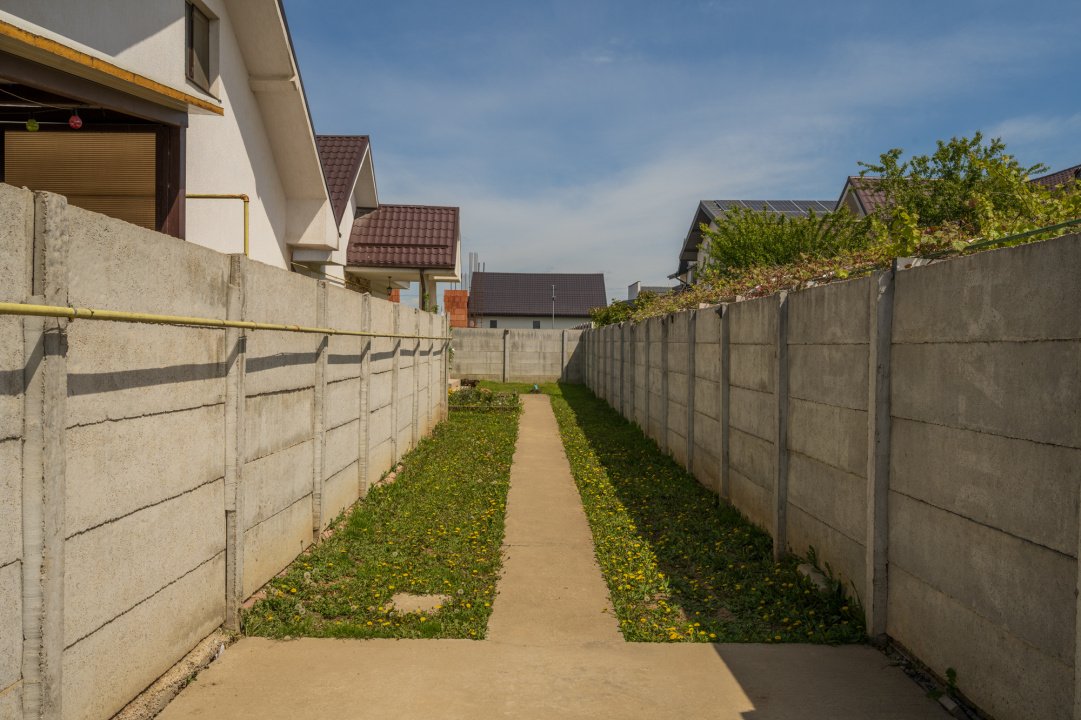 Curtea nu este foarte mare, dar este bine ingrijita, amenajata cu flori si pomi fructiferi. Se poate amenaja si un foisor, exista o zona potrivita chiar in fata casei. Terenul este in forma de L, cu o alee la intrarea dinspre strada (care face parte din proprietate, respectiv din lotul de teren al casei), zona in care s a amenajat un loc pentru parcat 1-2 masini.