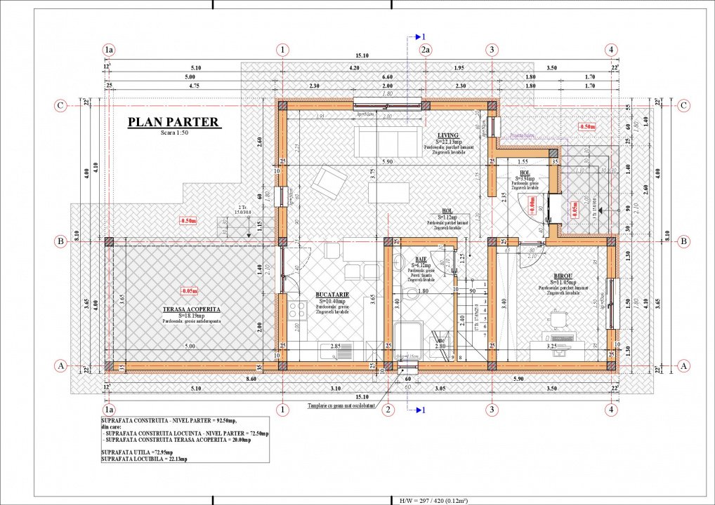 - Terasă acoperită în spatele casei – 18,19 mp, cu acces direct din bucătărie (poate fi închisă și transformată în bucătărie separată sau zonă de dining)