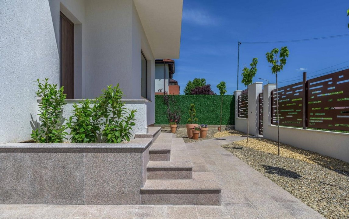 Interiorul este luminos și aerisit, cu un living spațios, zone bine delimitate și o circulație naturală între camere. Vila dispune de 3 dormitoare și 3 băi, finisate cu materiale atent alese, pentru un ambient elegant și coerent.