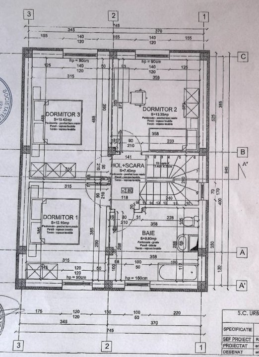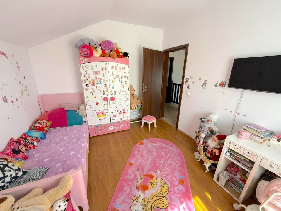La parter avem un living de 25mp, o bucatarie de 12mp si o baie de 4mp. Din hol se acceseaza etajul unde avem 3 dormitoare cu suprafete intre 12 si 15mp si o baie de 10mp.