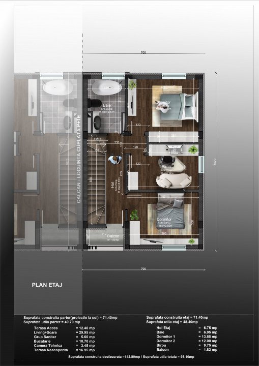 La etaj sunt 3 dormitoare, 1 baie si 1 balcon.